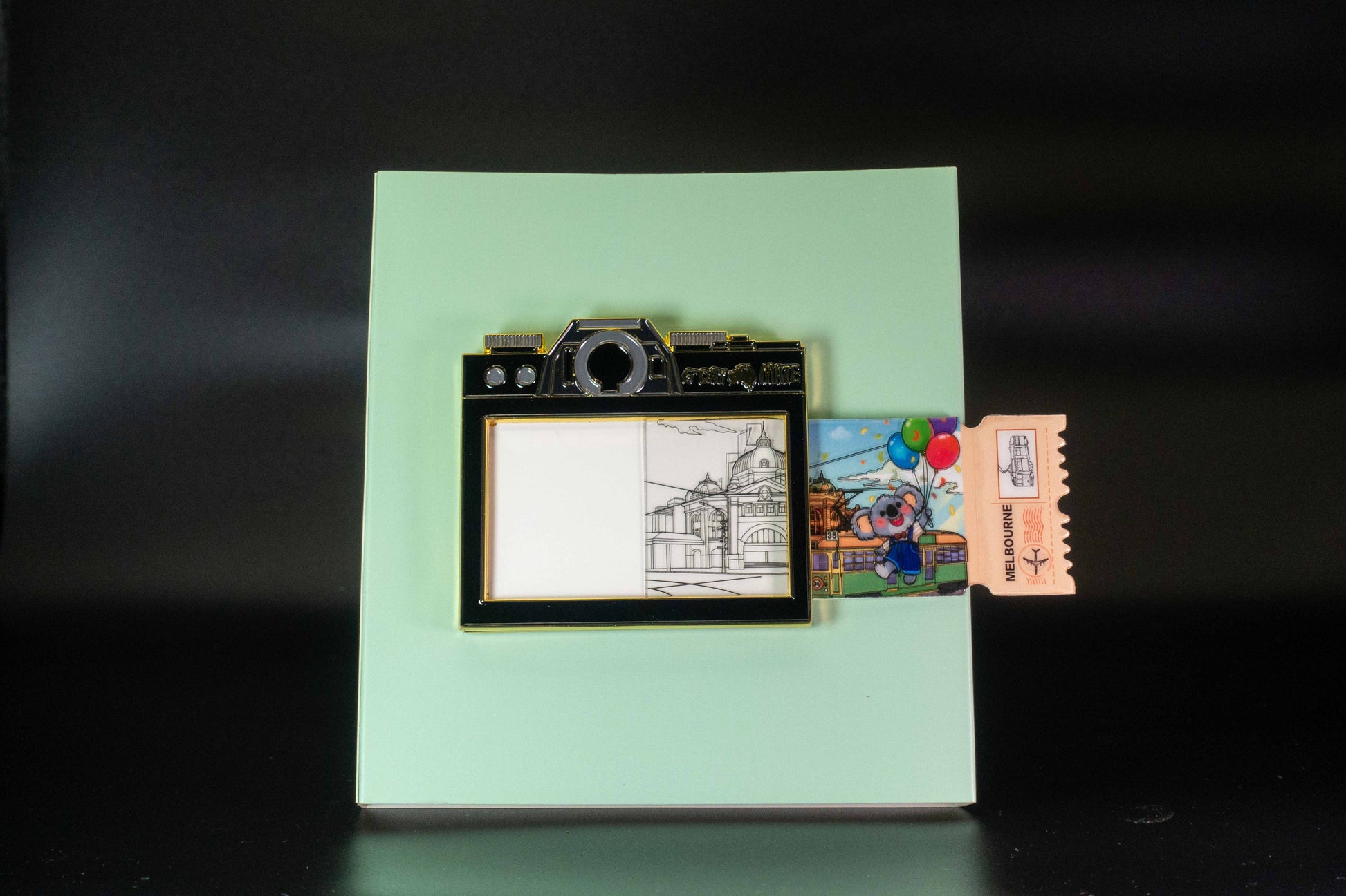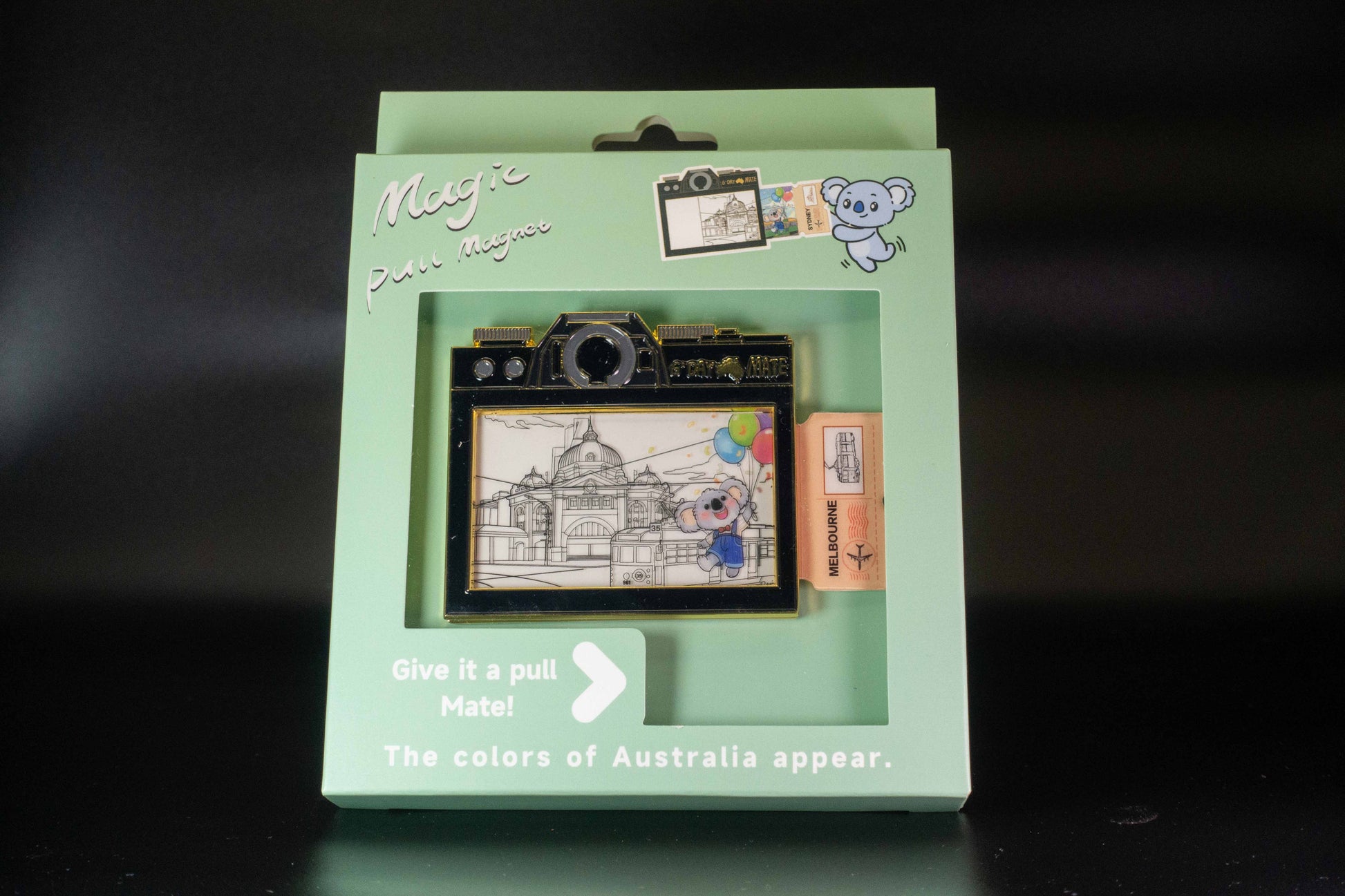 This playful magnet captures Melbourne’s charm with a creative twist. Featuring a line sketch of the iconic Flinders Street Station and a balloon-holding koala ready to float away, the scene transforms with a gentle pull of the ticket tab.